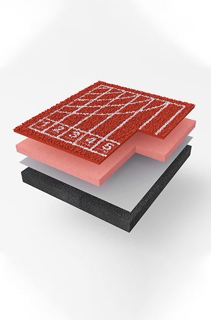 发泡型高弹聚氨酯中层采用特殊的微发泡技术形成的微气囊结构,使全塑型跑道系统的冲击吸收和回弹性能好,有效避免运动员和中小学生运动过程中膝盖、脚踝、足底等易受冲击部位的运动损伤。