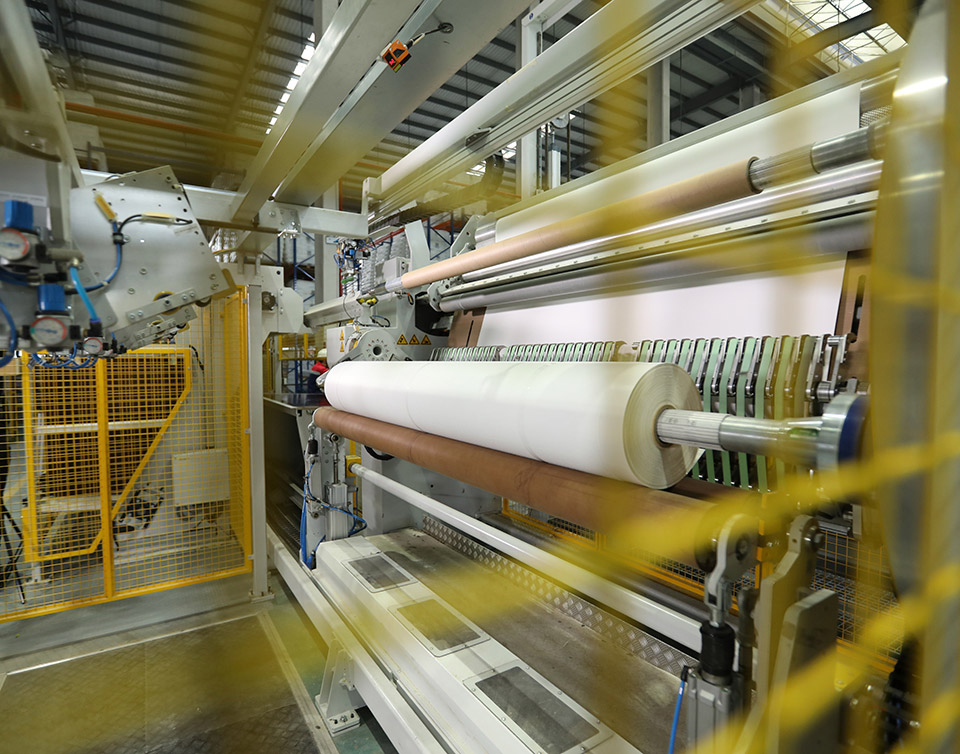 引进美国R&D、意大利Boato等公司改性沥青防水卷材生产线,引入德国克劳斯玛菲KraussMaffei高分子防水材料生产设备,采用德国爱立许、西门子技术,拜耳概念设计等技术,实现全流程信息化、自动化生产,树立了行业高产能、高精度、高稳定性的标杆。